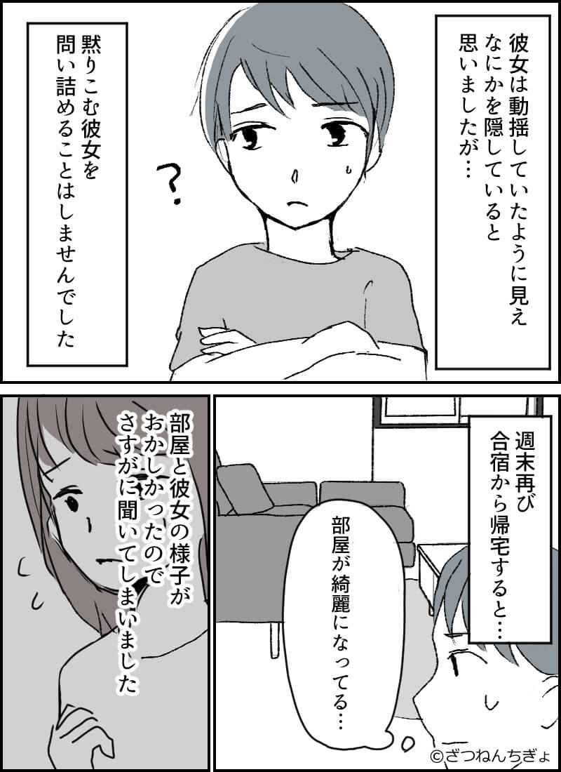 そして週末、再び合宿から帰ると、部屋は不自然なほど綺麗に片付いており、彼女の挙動もどこか落ち着きがありませんでした。