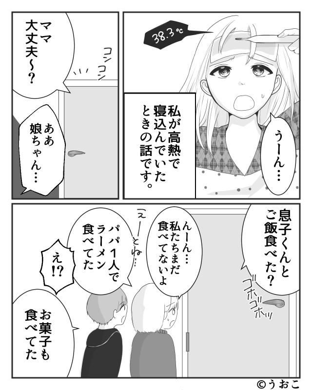 これは、私が38.3度の高熱を出して1日中寝込んでいたときのことです。 子どもたちから、夫が自分だけラーメンを作って食べ、お菓子までつまんでいたと聞かされたのです。