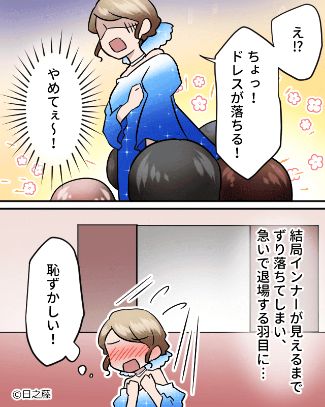 結局、インナーが見えるまでドレスがずり落ちてしまい、私は急いで会場から退場する羽目に…