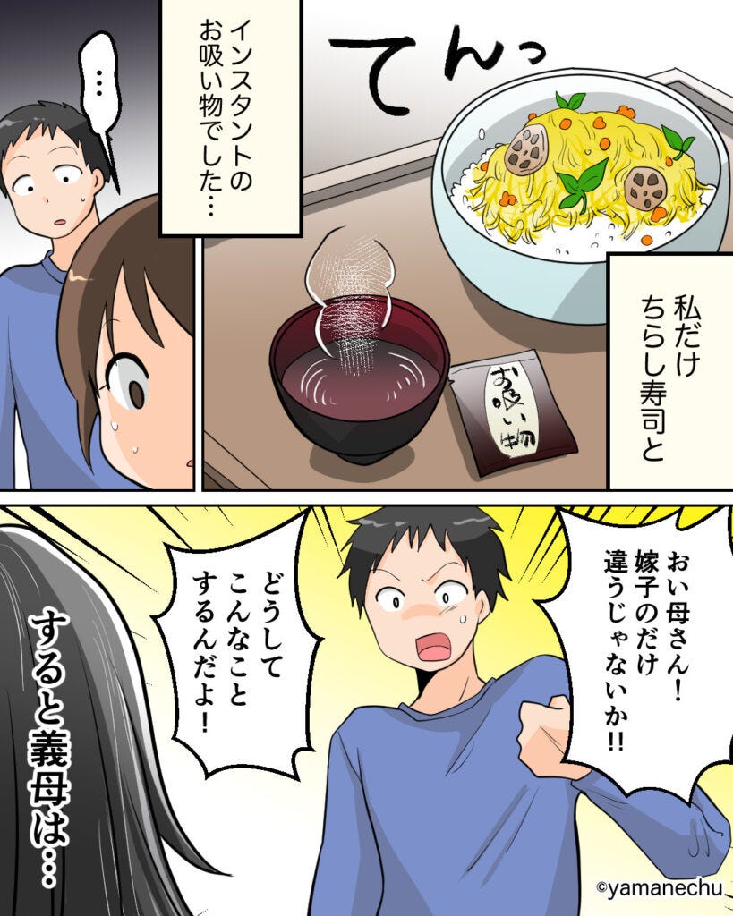 義実家での“豪華お寿司”にワクワク…!だが直後⇒「どうぞ~」義母が手渡した“嫁だけの一皿”に唖然!?