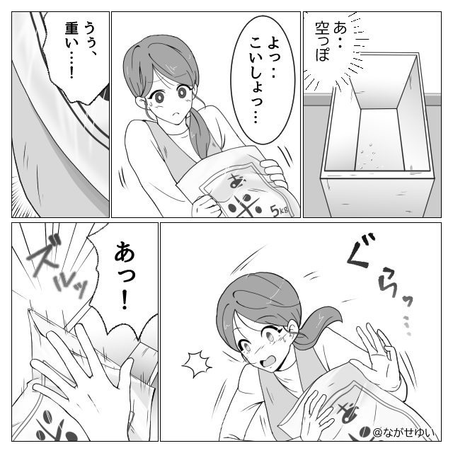 5キロのお米が『ザーッ!!』床に散乱し絶句。しかし“大きなお腹”で拾う妻をスルーした夫に…「なんだこれ!?」