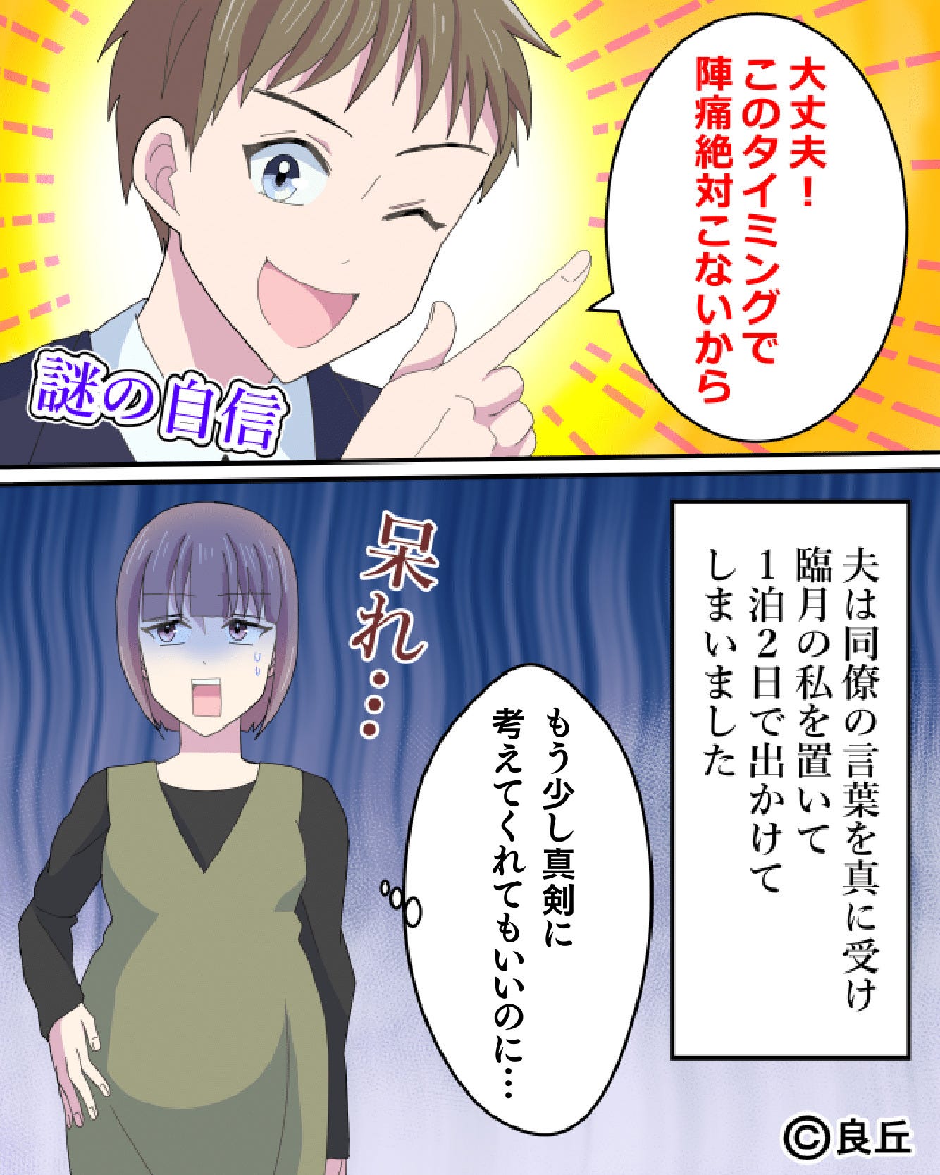 その後、夫は「大丈夫!このタイミングで陣痛絶対こないから」と、謎の自信を見せつけ、臨月の私を置いて1泊2日で出かけてしまいました。