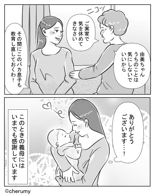 しかし、今回の主人公は第三者である義母の介入によって状況が一気に好転しました。