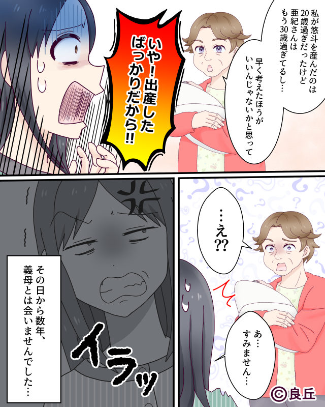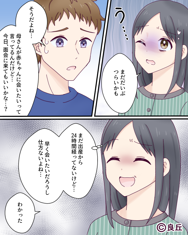 出産から24時間も経たないうちに来る無神経な義母、受け入れてしまった妻、妻への配慮がなかった夫、三者三様にどこかズレがあったと感じられるお話でした。