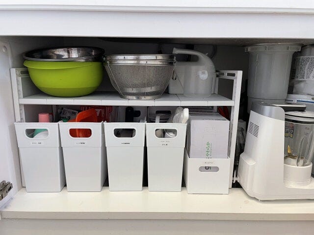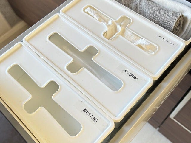 ビニール袋やビニール手袋、排水口ネットなど、キッチン周りにはごちゃごちゃしてしまうアイテムがたくさんあります。また、開封後はパッケージから出てしまって、ぐちゃぐちゃになったりして、どうしても収納内がすっきり見えません。