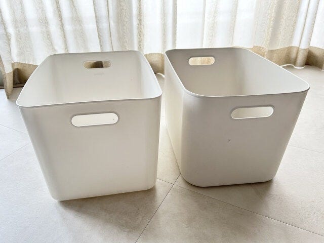 画像左側がR30ボックスで画像右側は無印良品の収納ボックスですが、形やサイズ感などがとても似ています。