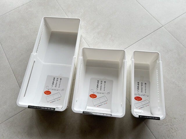 ラージ、ワイド、スリム、3つのサイズがあり組み合わせることにより引き出しや棚の幅に合わせて収納することが可能です。