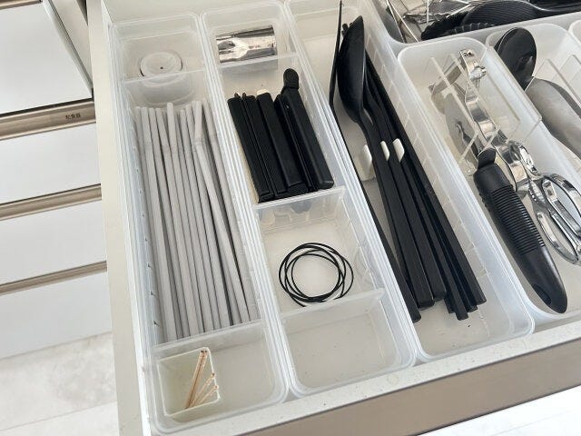 キッチンツールは長いものもあれば細かいグッズなどもあるので、このキッチントレーなら、長いものから細々した物までキレイに整理して収納できます。