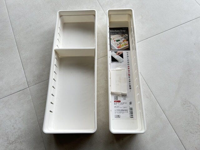 引き出しの中をピッタリ仕切ることができる伸縮できるトレーです。お客様宅でたくさん使うので、いつも自宅に大量にストックしています。