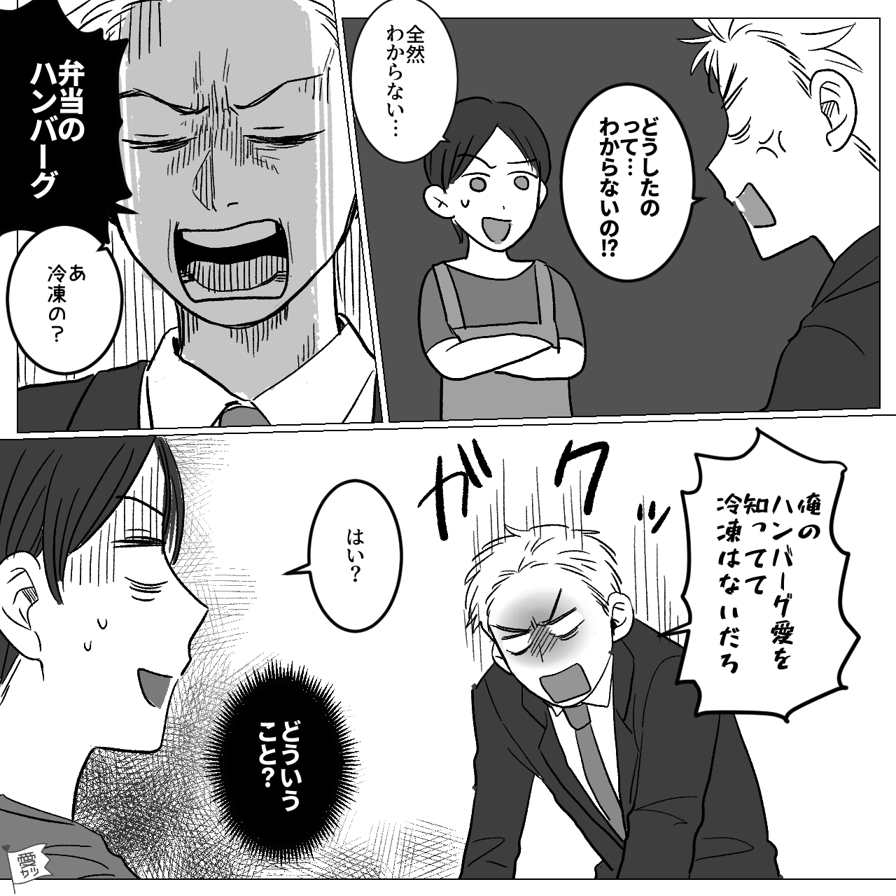 唖然とする私が「全然わからない…」と答えると、夫はさらに怒ったようで「弁当のハンバーグ!」「俺のハンバーグ愛を知ってて冷凍はないだろ」と言うのです。