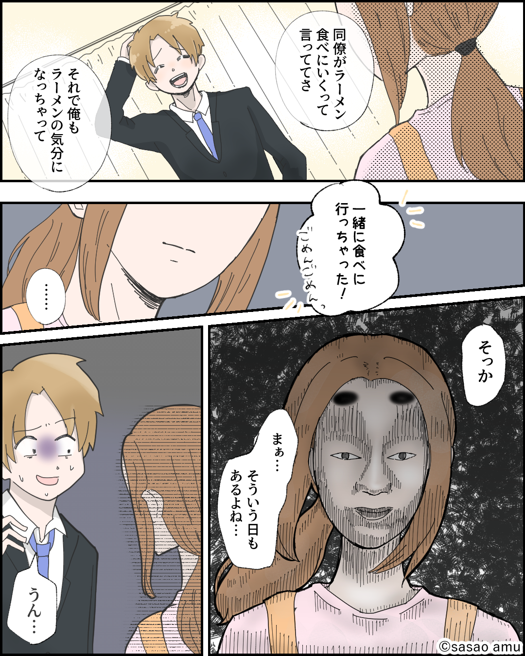 何も言わず聞いていた私はひと言「そっか…まぁ…そういう日もあるよね…」と、おそらく般若のような怖い顔で返したと思います。