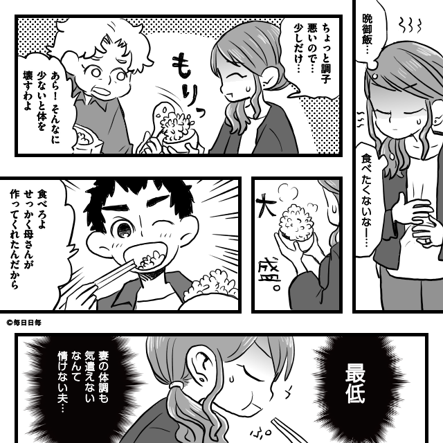体調不良で嘔吐した嫁に…大盛ご飯の”強要”する義母!?すると後日⇒【笑顔で放った言葉】に…義母「なに言ってるの!?」