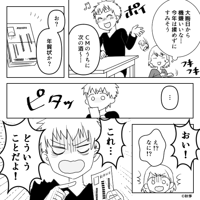 大晦日…上機嫌な夫が【年賀状】を見てブチギレ!?すると⇒“3時間も”妻への説教が続いたワケ。