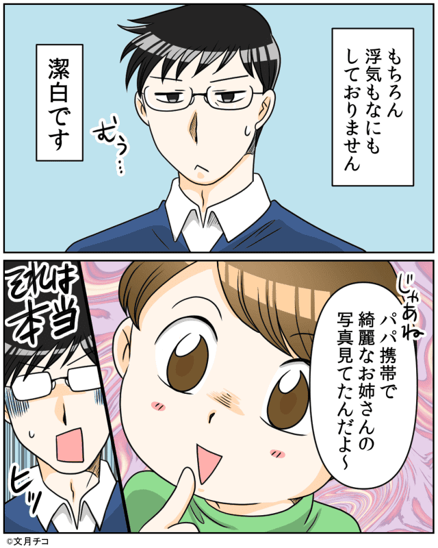 しかし直後、息子が「じゃあね~…パパが携帯で綺麗なお姉さんの写真見てたんだよ〜」と追撃!