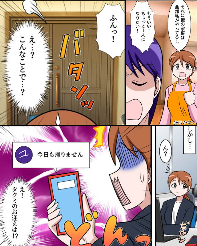 慌てて子どもを迎えに行き、なんとか間に合いましたが、結局夫は1週間帰ってきませんでした。