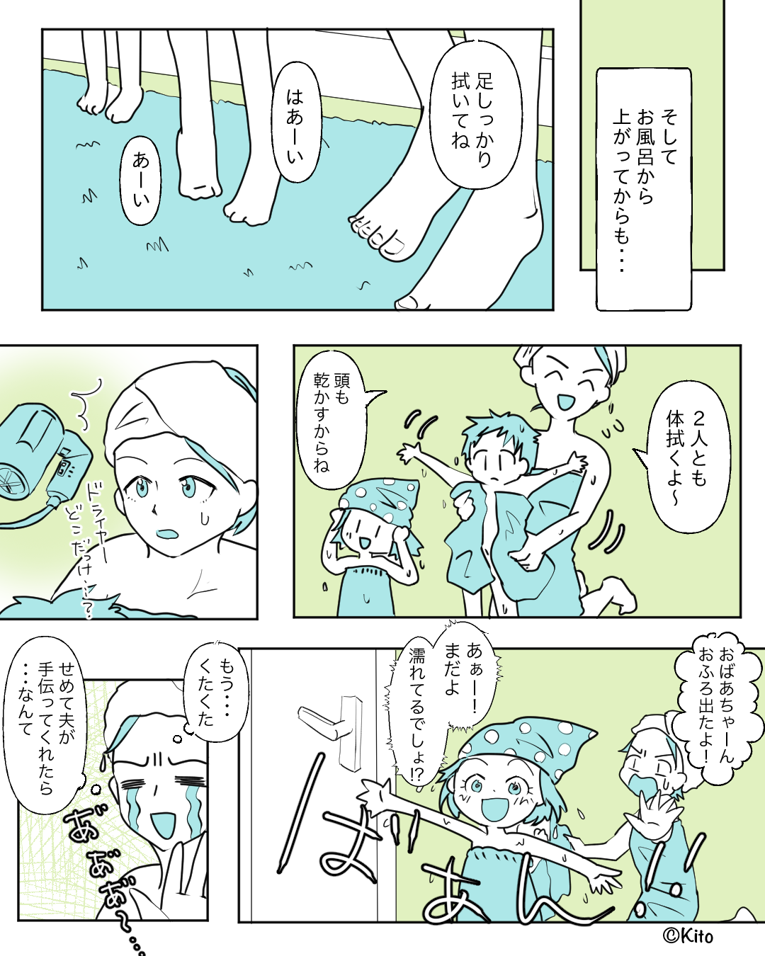 手慣れた手つきで「あなたは自分の着替えを済ませちゃって!」と子どもたちの髪を乾かしてくれます。