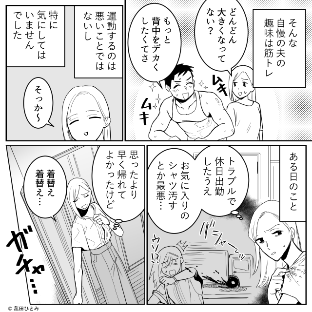 休日出勤を早く終えた妻。しかし帰宅後⇒『!!?』マッチョ夫の“秘密”を目撃してしまった話。