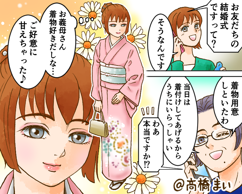 「お友達の結婚式ですって?」と聞かれ「そうなんです」と答えると、義母は「着物を用意しといたわ。当日は着付けしてあげるからいらっしゃい」と言ってくれたのです。