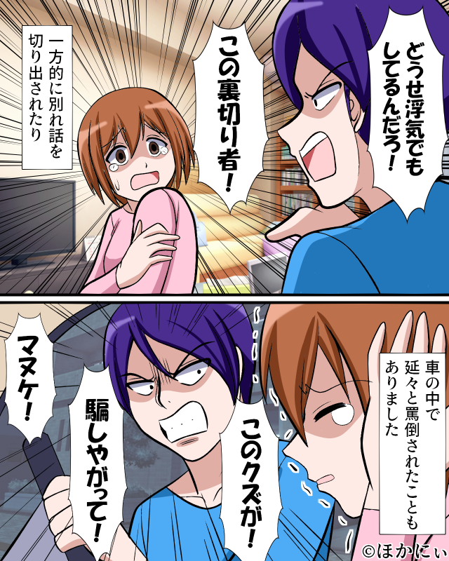 挙げ句には「どうせ浮気でもしてるんだろ!この裏切り者!」とわけもわからず怒鳴られて一方的に別れを切り出されたり、車の中で「騙しやがって!このマヌケ!」と延々と罵倒されたりしたことも。