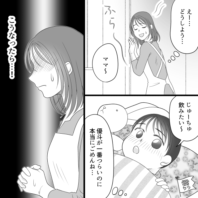 「どうしよう…」と私が途方に暮れていると、息子が「ママ〜じゅーちゅ飲みたい〜」と、つらそうな声で訴えてきます。