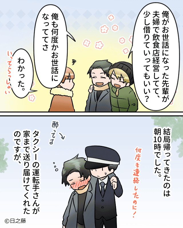 酔いつぶれている彼を、タクシーの運転手さんが家まで送り届けてくれました。
