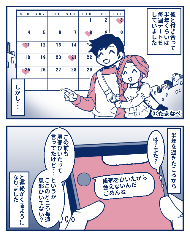 しかしその頃から、彼は毎週決まって「風邪をひいた」と言うようになり、なかなか会えない週が続いたのです。