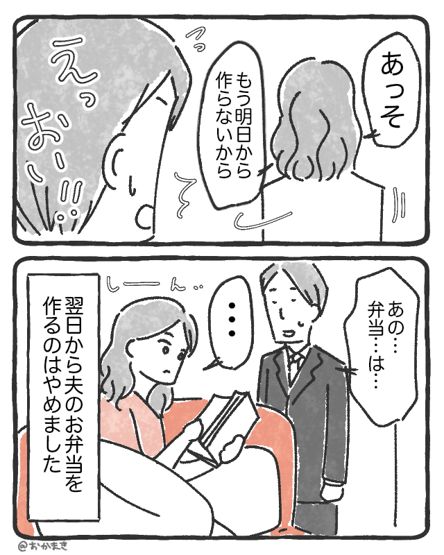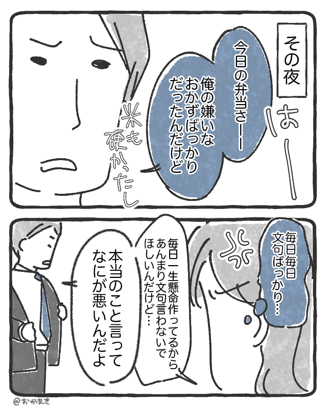 弁当への文句を“優しさ”だと勘違いする夫。しかし翌日⇒妻の【無言の攻撃】に…夫「あの…」