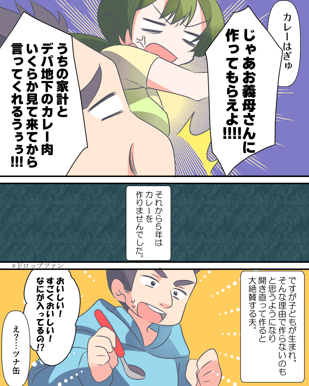 私は思わずブチ切れてしまい「じゃあ、お義母さんにつくってもらえよ!!!!」と激怒し、それから5年間、カレーを作らないという仕返しに出ました。
