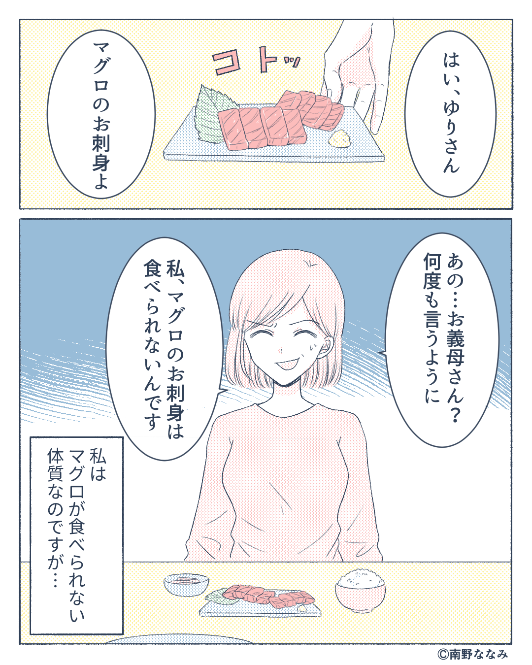 私はマグロを食べられない体質なのですが、義母は「はい、マグロのお刺身よ」と意地悪をして出してきます。