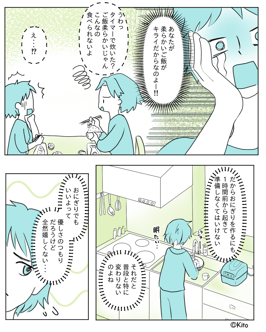 「ご飯が柔らかいけどタイマーで炊いた?こんなの食べられないよ」と言われるのがオチ。