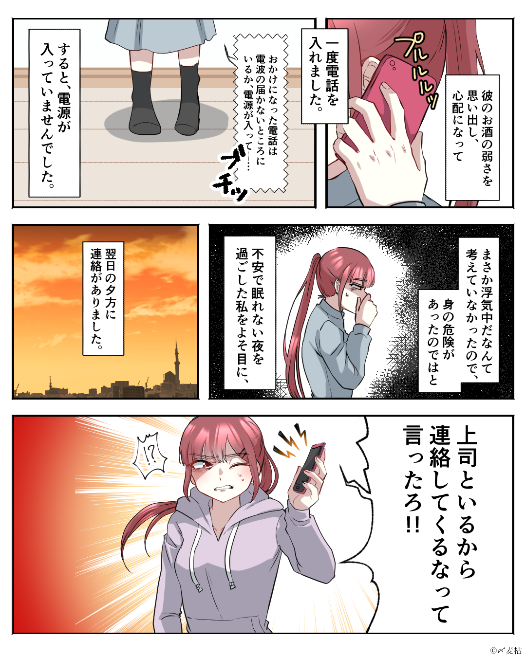 しかし、電話に出るといきなり「上司といるから連絡してくるなって言ったろ!」と怒鳴られてしまったのです。