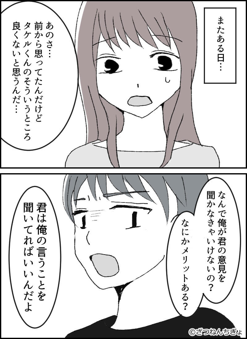 彼は明らかに不機嫌そうな顔で「なんで俺が君の意見を聞かなきゃいけないの?何かメリットある?君は俺の言うことを聞いてればいいんだよ」と突き返されてしまったのです。