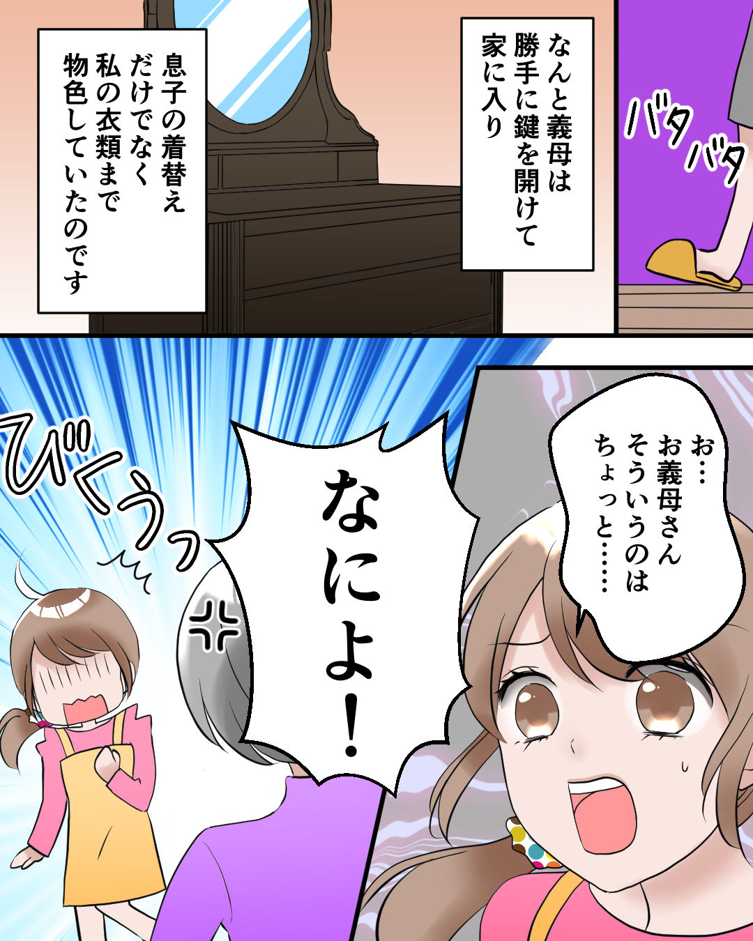 なんと、義母が勝手に玄関の鍵を開けて中に入ってきたのです。しかも息子の着替えだけでなく、私の衣類まで物色するという信じられない行動に出た義母。