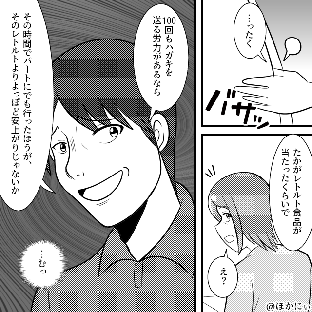 夫にとっては単なる食品一つでも、そこには妻の費やした時間や嬉しい思いが詰まっています。