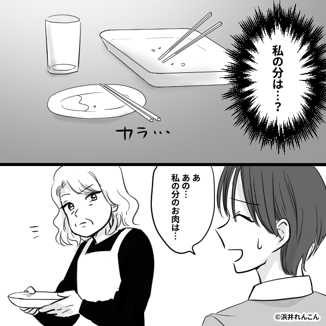 義実家で焼肉…しかし“嫁の分”はナシ?義母「食べるなんて知らなかったわ」直後⇒思わぬ【夫の対応】に青ざめる!
