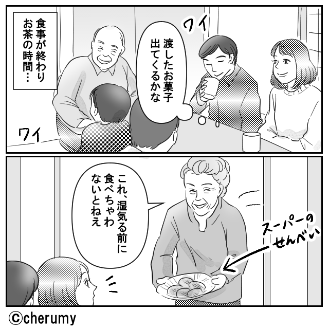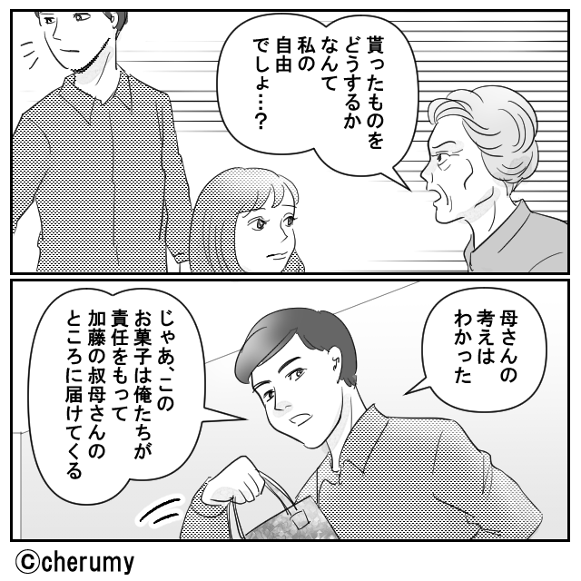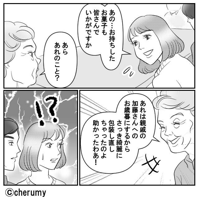 お礼であげたお菓子を…他人へのお歳暮にする義母!?しかし直後、夫の行動に「え、あんた!?」義母が焦りだした!?