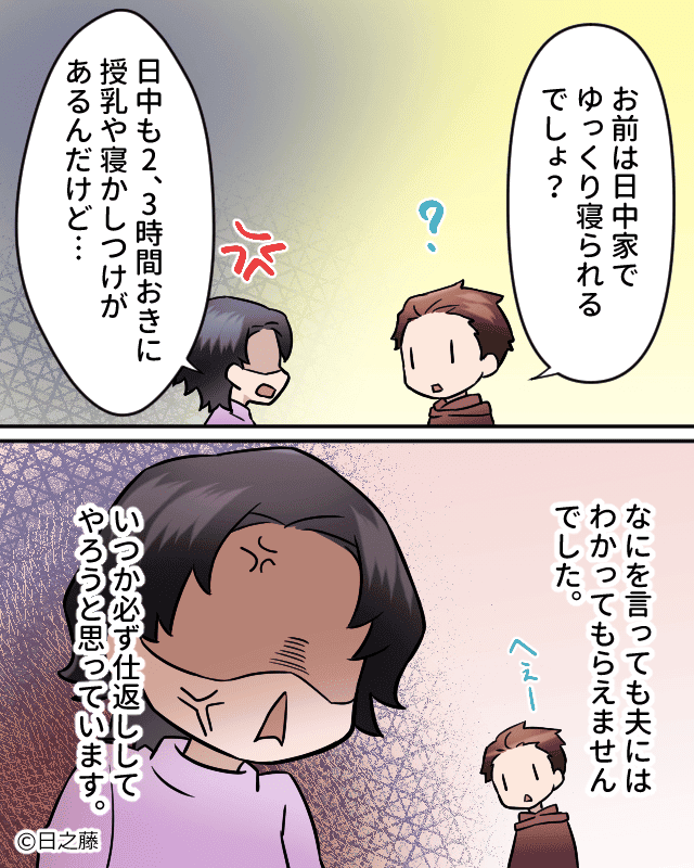たまらず「私は24時間ゆっくり寝られないんだけど…」と怒りに震えながら言い返したのですが、夫は「お前は日中家でゆっくり寝られるでしょ」と言うだけ。