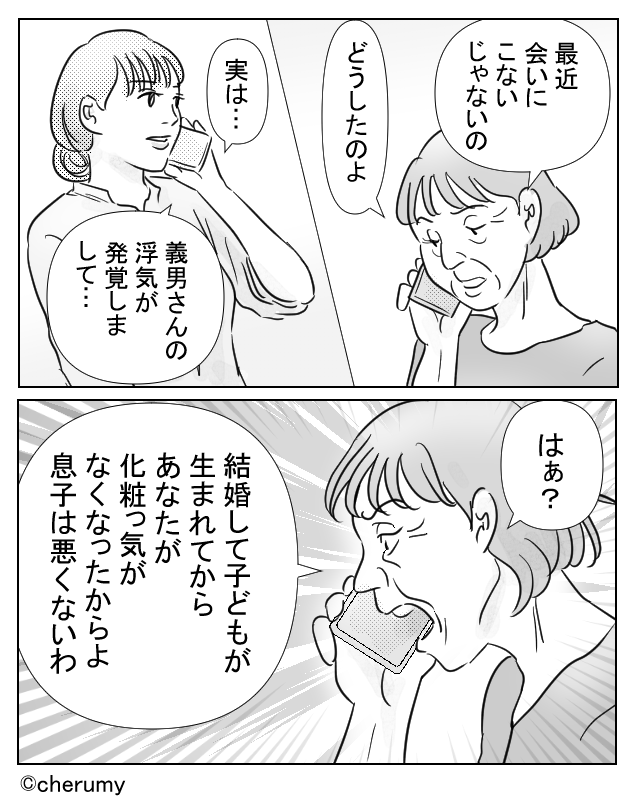 すると義母は「結婚して子どもが生まれてから、あなたに化粧っ気がなくなったからよ。息子は悪くないわ」と、私を責めてきたのです。