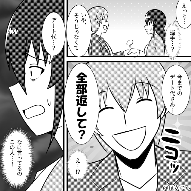 握手?と思い手を出した私に、彼は「そうじゃなくて、今までのデート代さぁ、全部返して?」と平然と言ってのけたのです。