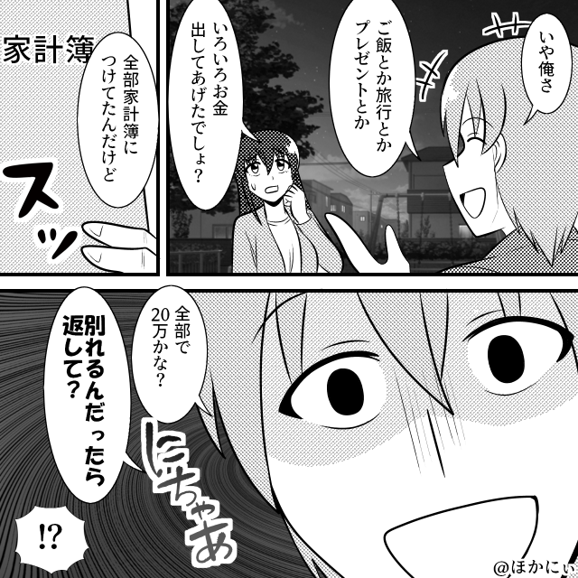 「ご飯も旅行も全部合わせて、20万円くらいかな?」「別れるなら返して。今なければ、振り込みでもいいよ」