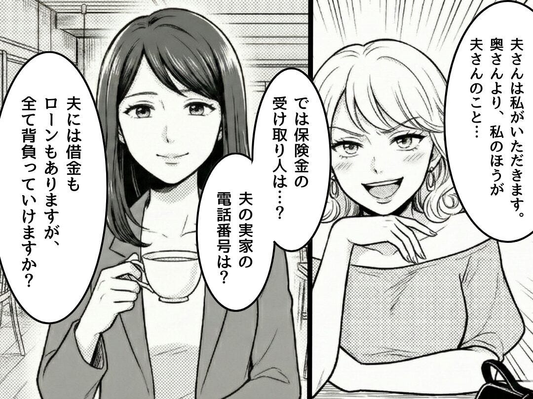 しかし私は感情的にならず、静かに「では保険金の受け取り人は…? 夫の実家の電話番号は? 今すぐ言えますか?夫には借金もローンもありますが、全て背負っていけますか?」と聞き返すと、女性は、みるみる真っ青になって言葉に詰まり、夫も顔色が変わったのです。