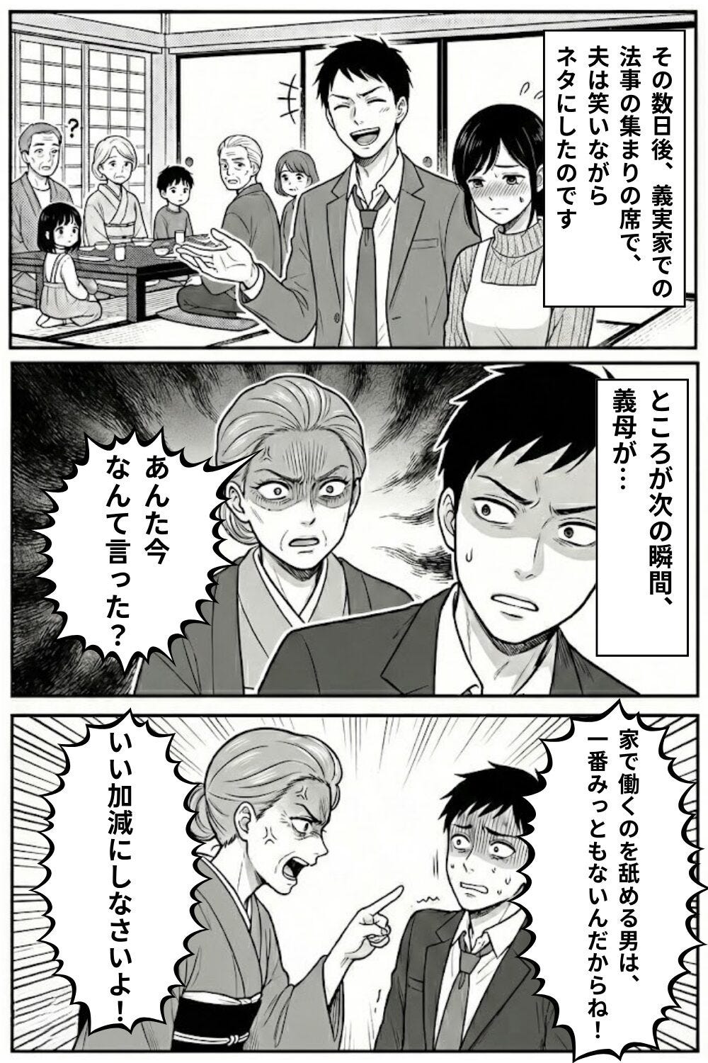 その数日後、義実家での法事の席で、夫は調子に乗ってその話を持ち出し、笑いながら親戚の前で「稼ぎも俺以下」と私をネタにしたのです。