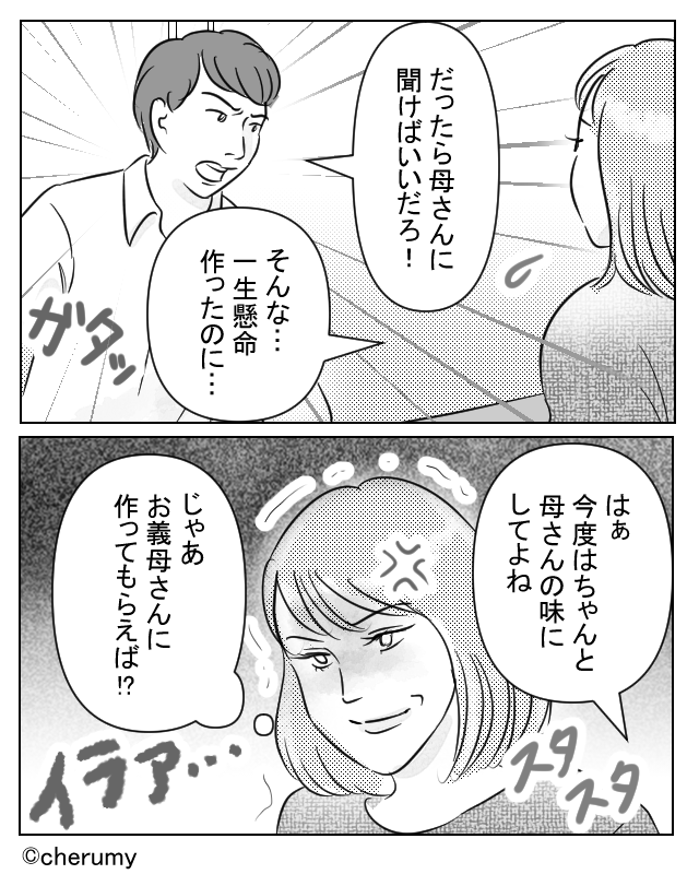 「母さんの味じゃない」と妻を責める夫!?だが次の瞬間「じゃあ…」妻が鬼の形相になった話
