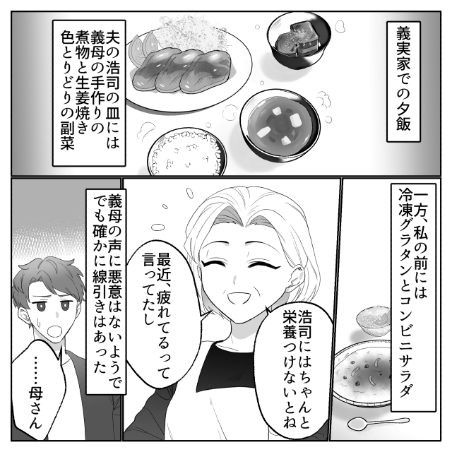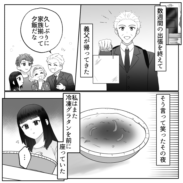 義実家での食事で…連日”嫁にだけ”冷凍グラタンを出す義母。しかし数週間後【義父の一言】で大逆転の結末が!?