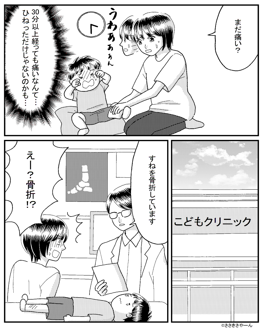 転んでから【30分以上】泣き続ける息子!?病院へ行くと⇒医師から告げられた“一言”に…母「えー!?」