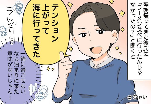 私が「ラーメンを食べに行ったんじゃなかったの?」と聞くと「テンション上がって、海に行ってきた!」と、悪びれる様子もなく答えてきて戦慄しました。