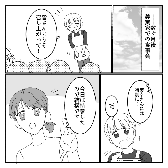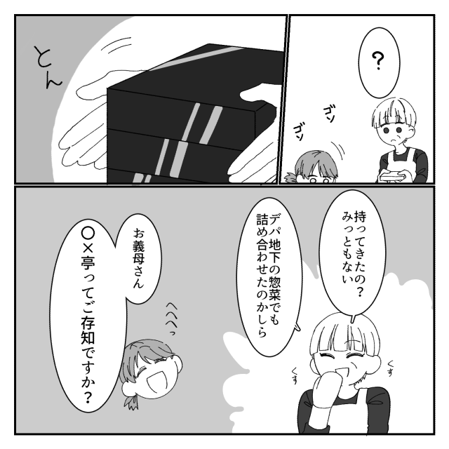義実家でご馳走が並ぶ中…嫁には“半額惣菜”を渡す義母!?後日⇒「ぜひ食べてください」嫁が差し出したモノに…震える!?