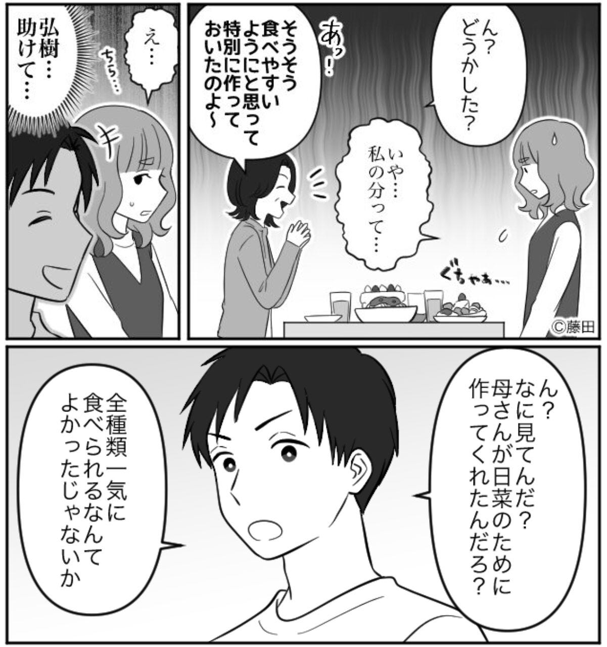 義実家に行って、義母に嫌がらせを受けたときも、ぐちゃぐちゃにされた料理を見ても「母さんがお前のために作ったんだろ?」「全種類一気に食べられるなんてよかったじゃないか」なんて言ってのける始末。
