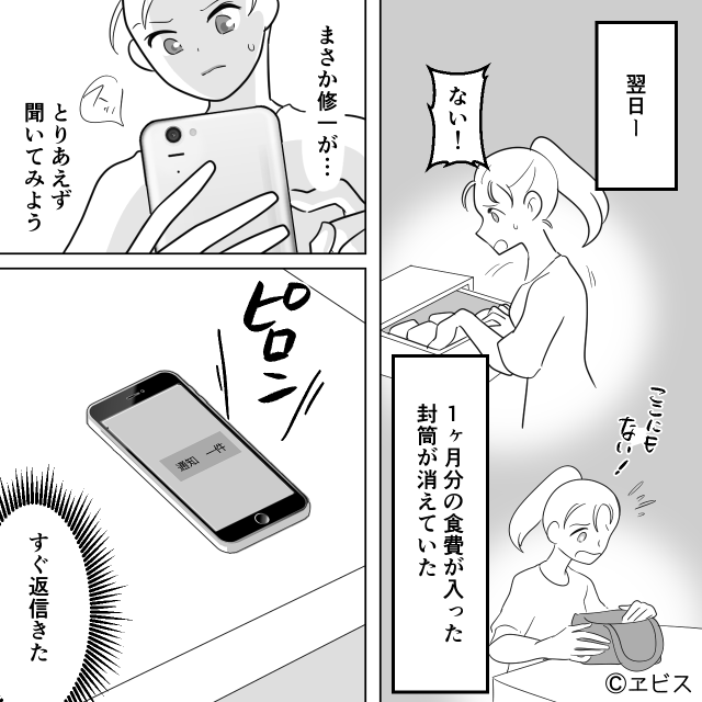 1ヶ月分の食費が入っていた封筒が消えていた時は、家から持ち出す前だったこともあり、犯人は夫しか考えられませんでした。