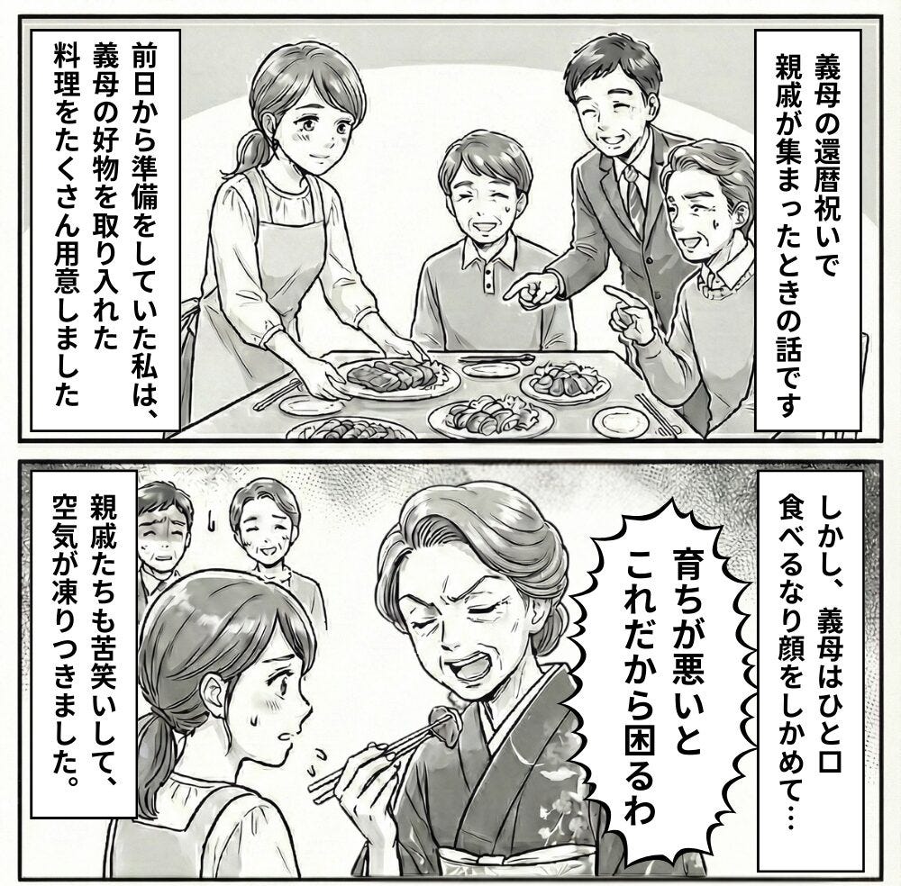 ところが義母は、ひと口食べるなり顔をしかめて箸を置き「こんな安いお肉を出すなんて私の顔に泥を塗るつもり?育ちが悪いとこれだから困るわ」と、大声で皮肉を言って私を笑いものにしたのです。